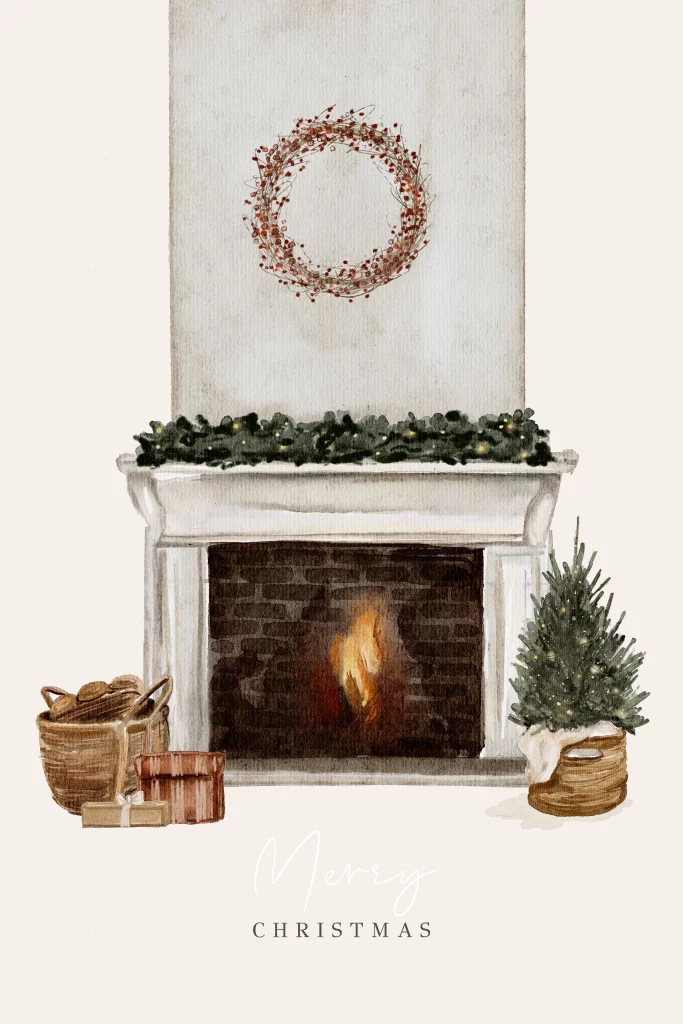 Kerstkaart illustratie met open haard cadeautjes en kerstboom