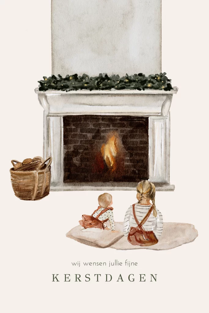 Prachtige illustratieve kerstkaart met een huiselijk tafereel. Bij de open haard zitten een oudere zus met een baby zusje. Je kunt alle illustraties op deze kaart zelf aanpassen, dus iedere gezinssamenstelling is mogelijk!