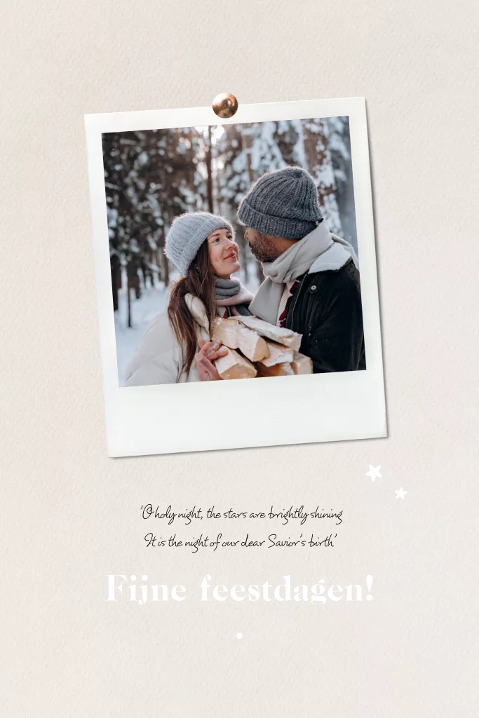 Kerstkaart met ruimte voor een eigen foto. De achtergrond heeft een klein structuurtje en daarop staat een polaroid foto. Plaats je eigen foto in de kaart en pas de teksten aan. De tekst en sterren worden gedrukt in zwartfolie folie, maar kunnen in iedere gewenste kleur.