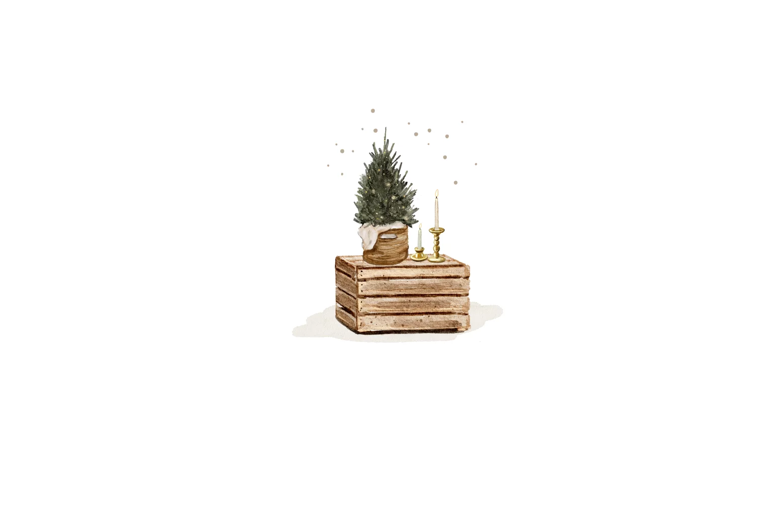 Wat een sfeervolle kerstkaart is dit. Op een krat staat een kerstboom en daarnaast brandende kaarsen. De illustraties kan je zelf bewerken of nog nieuwe tekeningen toevoegen. Zo krijg je echt een unieke en persoonlijke kerstkaart. De tekst wordt gedrukt in goudfolie voor wat extra glans.