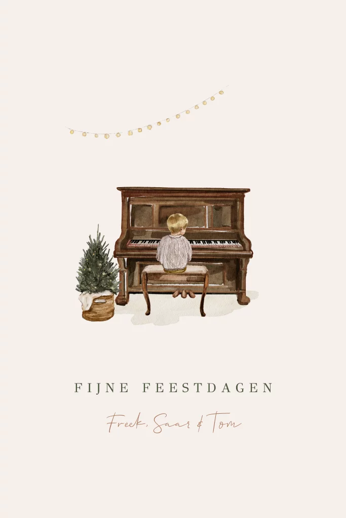 Getekende kerstkaart met een mooie illustratie van een piano en op de kruk een jongetje. Naast de piano staat een kerstboom. Je kunt deze kaart helemaal personaliseren met kindjes en aanpassen met alle leuke illustraties in de mappen.