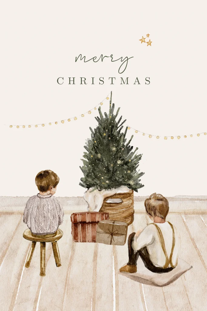 Unieke kerstkaart met twee jongens bij een kerstboom