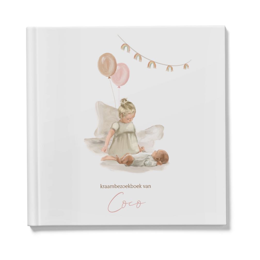 Een prachtig geschilderd kraambezoekboek voor een tweede kindje met een ouder zusje bij een baby. De mooi geverfde roze ballonnen en de slingers met regenboogjes maken het feest van de geboorte van jullie dochter compleet. Je kunt deze omslag helemaal zelf aanpassen. De binnenkant van het boek bevat standaard pagina's. Bekijk hier de binnenkant