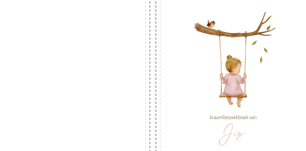 Leg alle mooie wensen en herinneringen van jullie kraamtijd vast in dit unieke kraambezoekboek. Het ontwerp laat een vrolijk meisje zien die op een schommel speelt, terwijl een vogeltje toekijkt – helemaal in een warme, herfstige sfeer. Perfect passend bij het geboortekaartje en andere items uit dezelfde collectie.