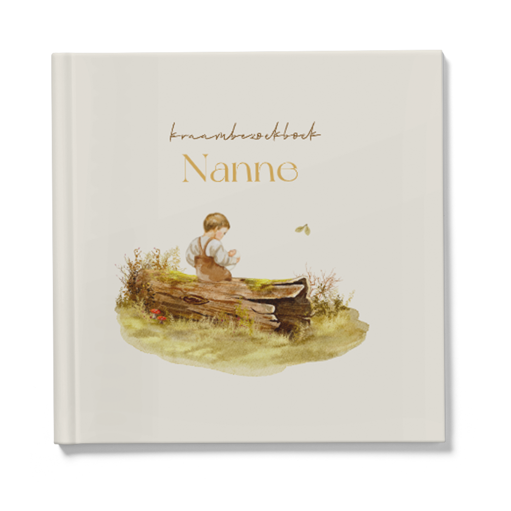 Leuk kraambezoekboek met een illustratie van een boomstam, een grote broer en een baby. De binnenkant van het boek bevat standaard pagina's. Bekijk hier de binnenkant