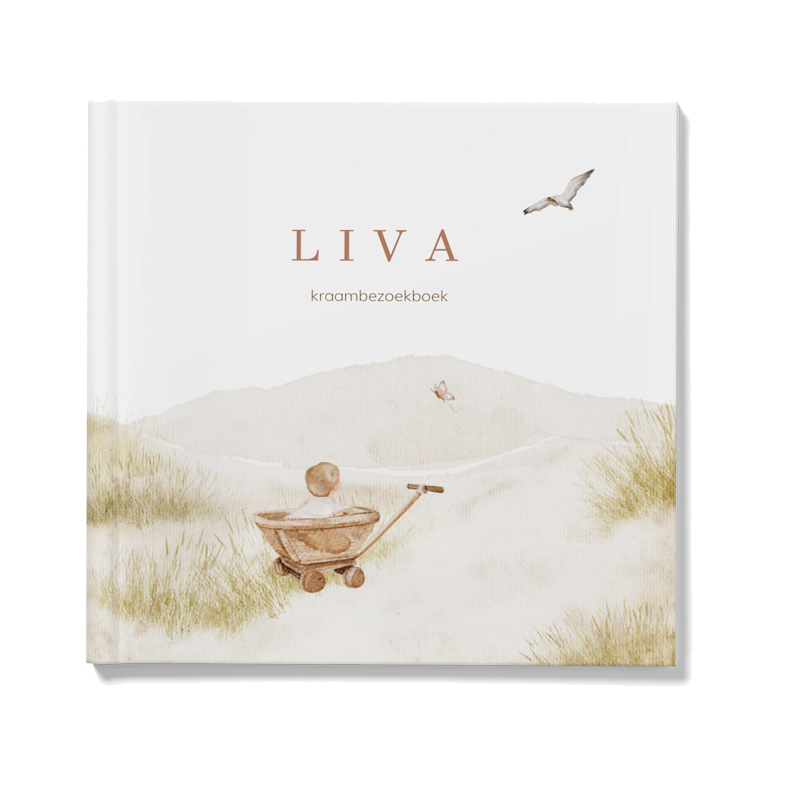 Prachtig geïllustreerd kraambezoekboek voor een pasgeboren meisje. De voorkant van dit boek heeft een illustratie van een baby meisje in een bolderkar op het strand en een roze vlinder. Je kunt deze omslag helemaal zelf aanpassen. De binnenkant van het boek bevat standaard pagina's.