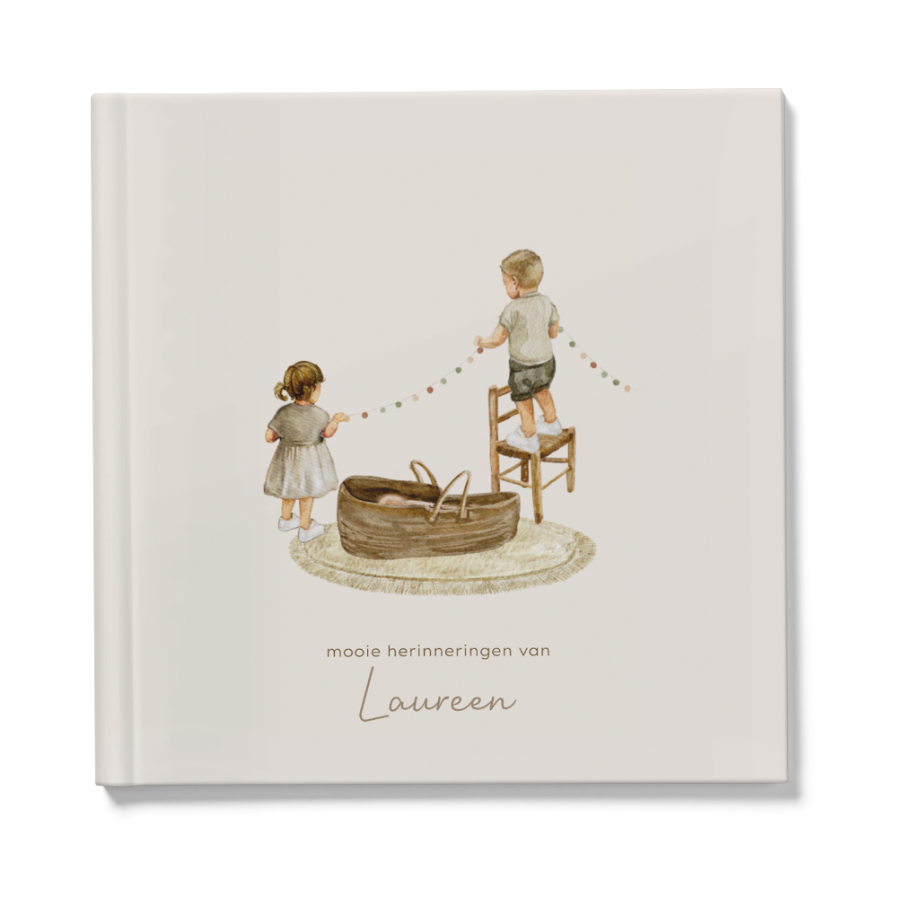 Lief kraambezoekboek voor de geboorte van een zusje. In het midden staat een grote broer en een zus bij een mandje. De grote broer en de grote zus hangen samen de slingers op voor hun babyzusje. Een uniek boek door de waterverf illustraties. Je kunt deze omslag helemaal zelf aanpassen met andere kindjes of andere teksten. De binnenkant van het boek bevat standaard pagina's. Bekijk hier de binnenkant