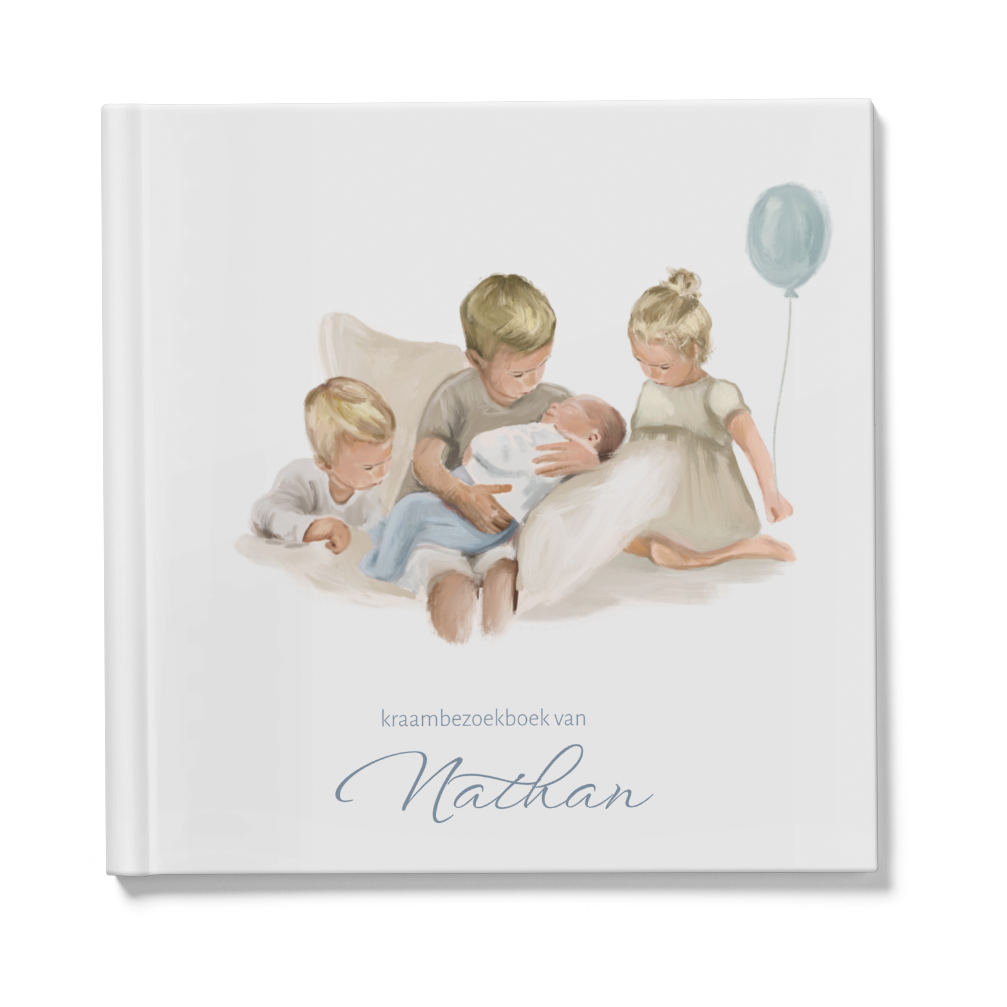 Prachtig geïllustreerd kraambezoekboek voor een pasgeboren jongen met olieverf. De voorkant van dit boek heeft een illustratie van een baby, een grote broer een zus en een kleiner broertje. Je kunt deze omslag helemaal zelf aanpassen naar je eigen gezinssamenstelling. De binnenkant van het boek bevat standaard pagina's. Bekijk hier de binnenkant