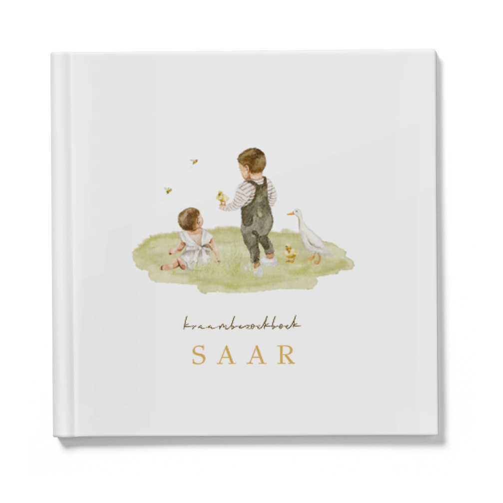 Kraambezoekboek met een lief lentethema, waarin een grote broer samen met zijn pasgeboren zusje en schattige eendjes centraal staan. Verzamel herinneringen en persoonlijke wensen van jullie kraamvisite in dit prachtige boek. Een waardevolle herinnering aan een bijzondere tijd! De binnenkant van het boek bevat standaard pagina's.