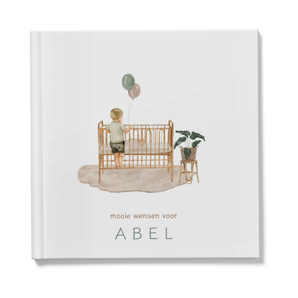Lief kraambezoekboek voor een broertje. In het ledikant ligt een baby en een broertje staat op het randje te kijken naar de baby. Hij heeft een groene en taupe ballon in zijn handjes. Je kunt deze omslag helemaal zelf aanpassen in onze editor.. De binnenkant van het boek bevat standaard pagina's. Bekijk hier de binnenkant