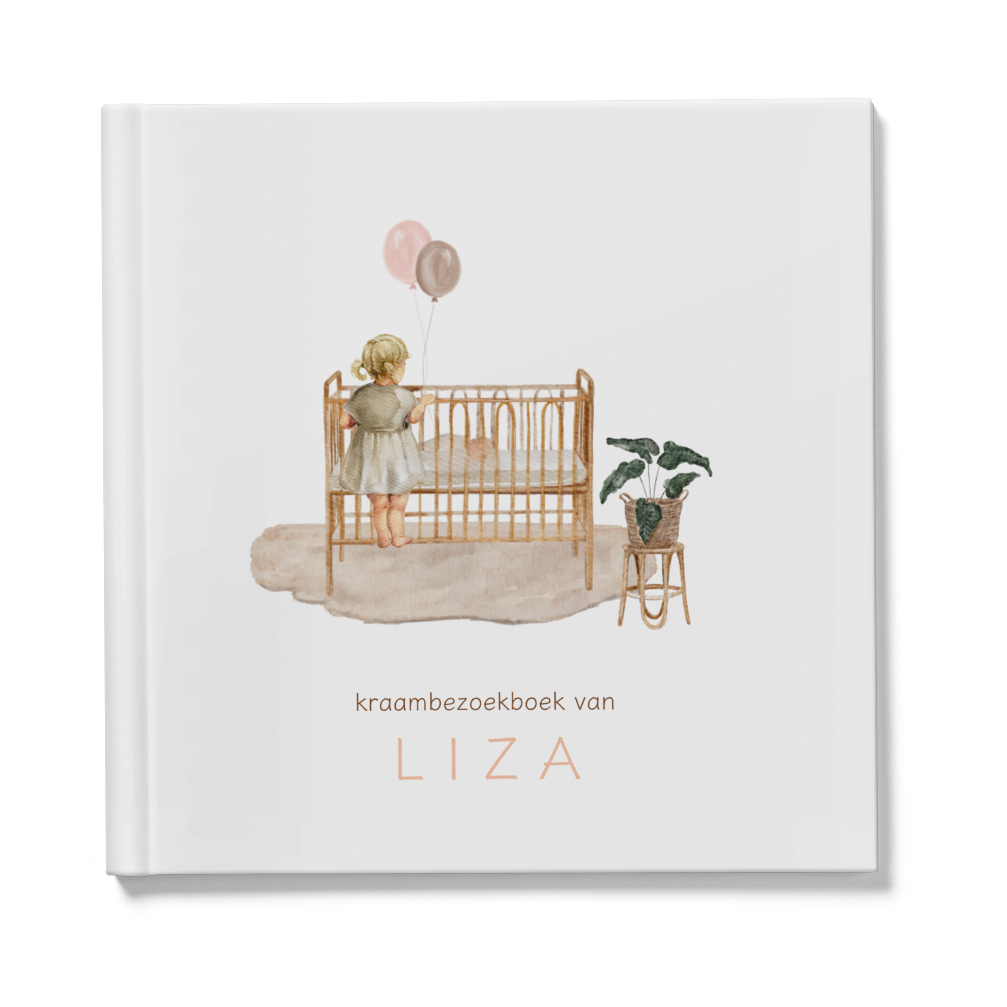 Wat een lief kraambezoekboek is dit voor een tweede kindje. In het ledikant ligt een baby en op de rand staat een zusje met roze ballonnen in haar hand. Je kunt deze omslag helemaal zelf aanpassen. De binnenkant van het boek bevat standaard pagina's. Bekijk hier de binnenkant