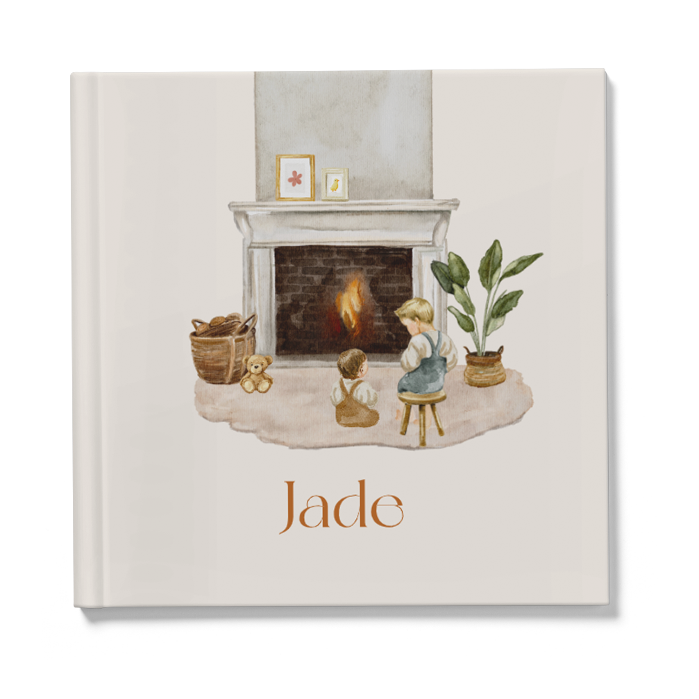Leuk kraambezoekboek voor een zusje met een illustratie van een knusse woonkamer met een haard en twee broertjes op een krukje. De binnenkant van het boek bevat standaard pagina's. Bekijk hier de binnenkant