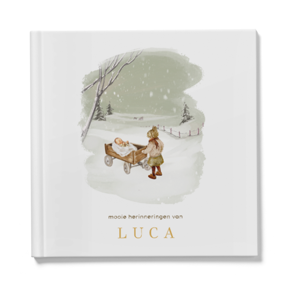 Wat een mooi getekend kraambezoekboek is dit. De achtergrond heeft een tekening van een landschap met sneeuw en voorop staat een bolderkar met een baby. Daarnaast een ouder zusje. Lief boek voor een tweede kind, maar je kunt het ook aanpassen met andere illustraties van kindjes. Je kunt deze omslag helemaal zelf aanpassen. De binnenkant van het boek bevat standaard pagina's.
