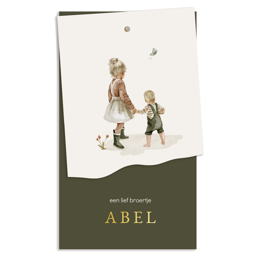 Lief geboortekaartje die bestaat uit 2 labels. Het achterste label is donkergroen en heeft goudfolie tekst. Het voorste label heeft prachtige illustraties van een getekende zus en broertje. Dit kabelkaartje voor jullie zoon kan je zelf bewerken en aanpassen met tekeningen uit onze beeldbank. Maak de labels vast met een splitpen.