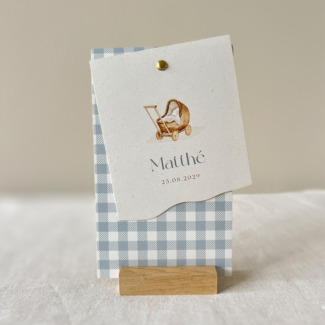 Lief geboortekaartje voor een jongen die bestaat uit 2 labels. Het achterste label heeft blauwe ruitjes. Het voorste label heeft een achtergrond van structuur papier en een illustratie van een getekend poppen wagentje. Dit labelkaartje voor jullie kindje kan je zelf bewerken en aanpassen met tekeningen uit onze beeldbank. Maak de labels vast met een splitpen of met een mooi lintje of touwtje. De kleuren van de ruitjes kan je aanpassen naar iedere gewenste kleur.