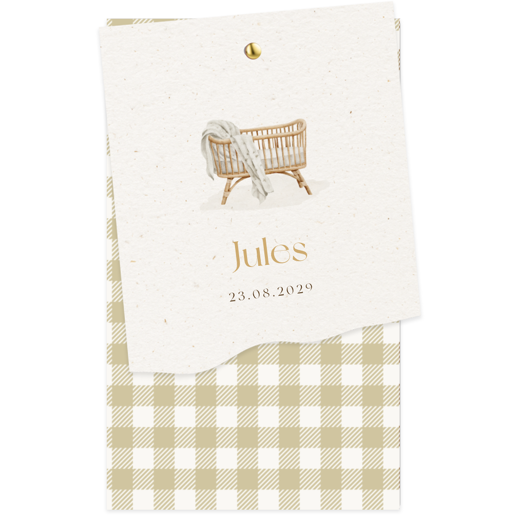 Lief neutraal geboortekaartje die bestaat uit 2 labels. Het achterste label heeft groene ruitjes. Het voorste label heeft een achtergrond van structuur papier en een illustratie van een getekend wiegje. Dit labelkaartje voor jullie kindje kan je zelf bewerken en aanpassen met tekeningen uit onze beeldbank. Maak de labels vast met een splitpen. Leuk voor zowel jongens als meisjes!