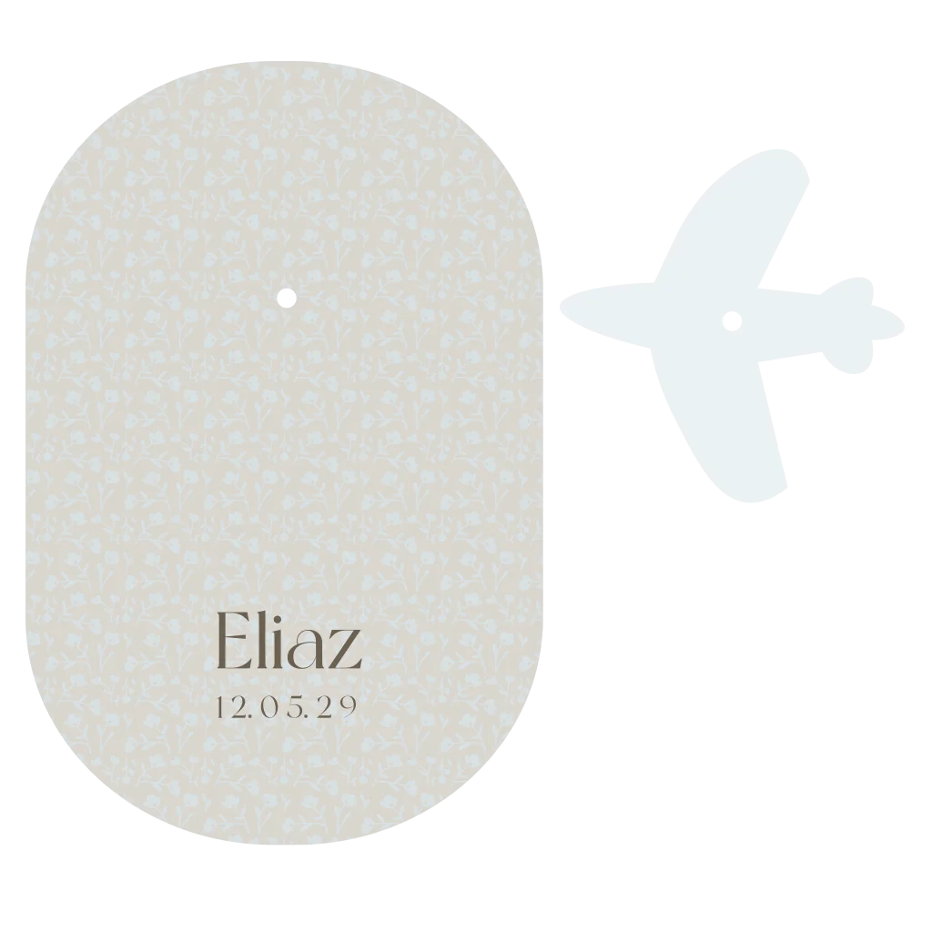 Een super leuk origineel geboortekaartje in een ovale vorm en een label in de vorm van een vliegtuig, die je kan bevestigen met een splitpen. (De splitpen moet je er los bij bestellen) De achtergrond heeft een patroon van kleine bloemetjes. Kleuren en tekst kunnen aangepast worden.