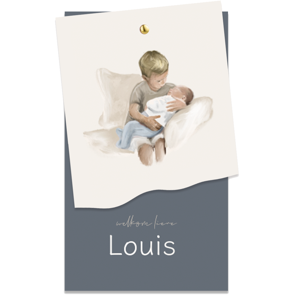 Lief olieverf geboortekaartje die bestaat uit 2 labels. Het achterste label is blauw en heeft hoogglans naam. Het voorste label heeft prachtige illustraties van een geschilderde broer met broertje. Dit labelkaartje voor jullie zoon kan je zelf bewerken en aanpassen met tekeningen uit onze beeldbank. Maak de labels vast met een splitpen.