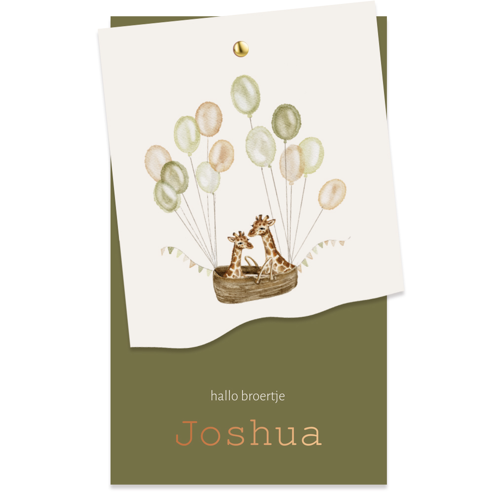 Lief geboortekaartje die bestaat uit 2 labels. Het achterste label is groen en heeft goudfolie tekst. Het voorste label heeft prachtige illustraties van twee giraffen in een mand met oranje en groene ballonnen. Dit labelkaartje voor jullie zoon kan je zelf bewerken en aanpassen met tekeningen uit onze beeldbank. Maak de labels vast met een splitpen.