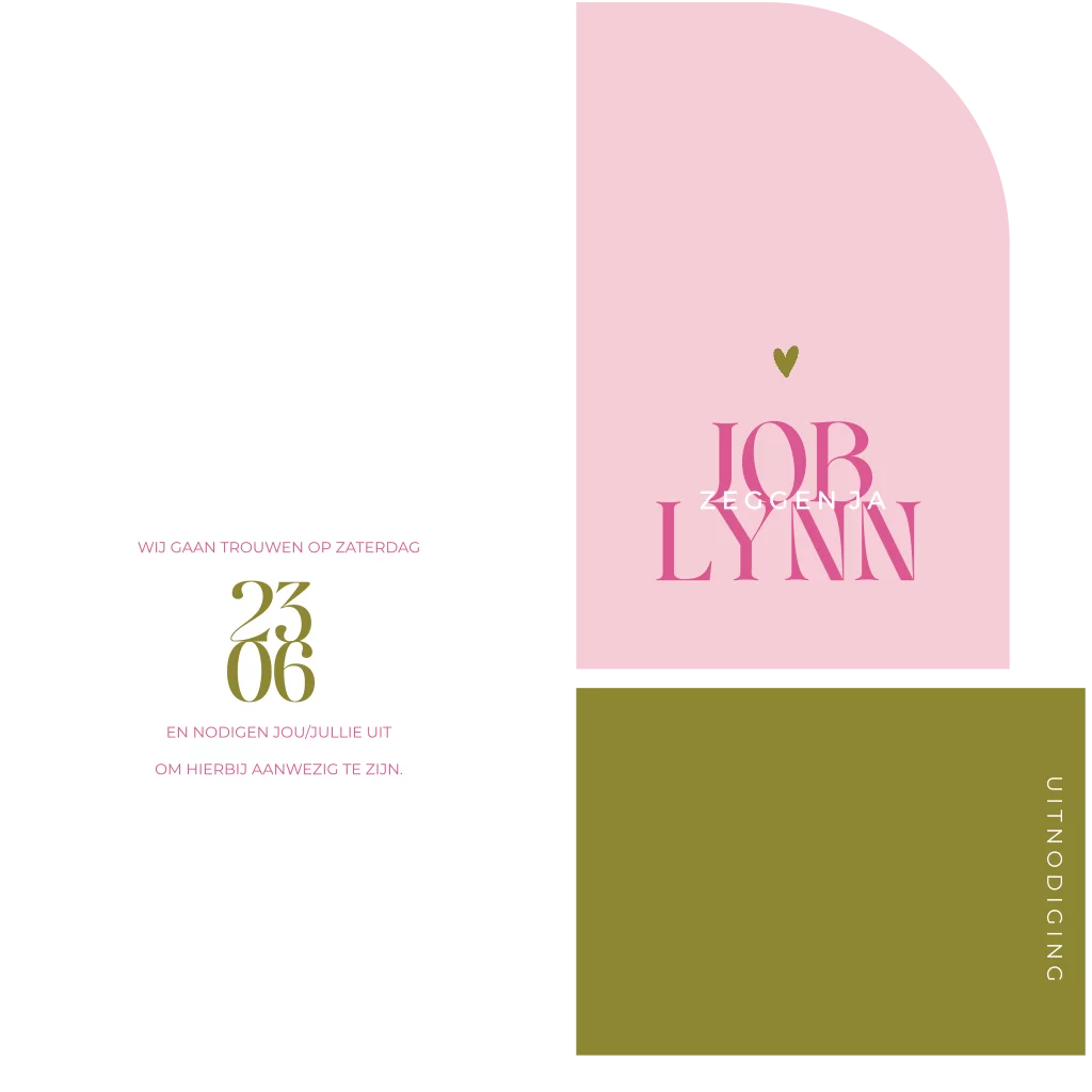 Op zoek naar een unieke en trendy trouwkaart? Ontdek onze hippe stapelkaart in de prachtige kleuren groen, fuchsia en roze. Deze bijzondere trouwkaart bestaat uit drie verschillende kaartjes die je op elkaar legt en vervolgens vastmaakt met een paperclipje of touw. Het resultaat is een originele en speelse uitnodiging die perfect past bij jullie bijzondere dag. Deze serie trouwkaarten biedt verschillende kaarten in hetzelfde kleurthema, zodat je de perfecte combinatie kunt vinden die past bij jullie stijl.