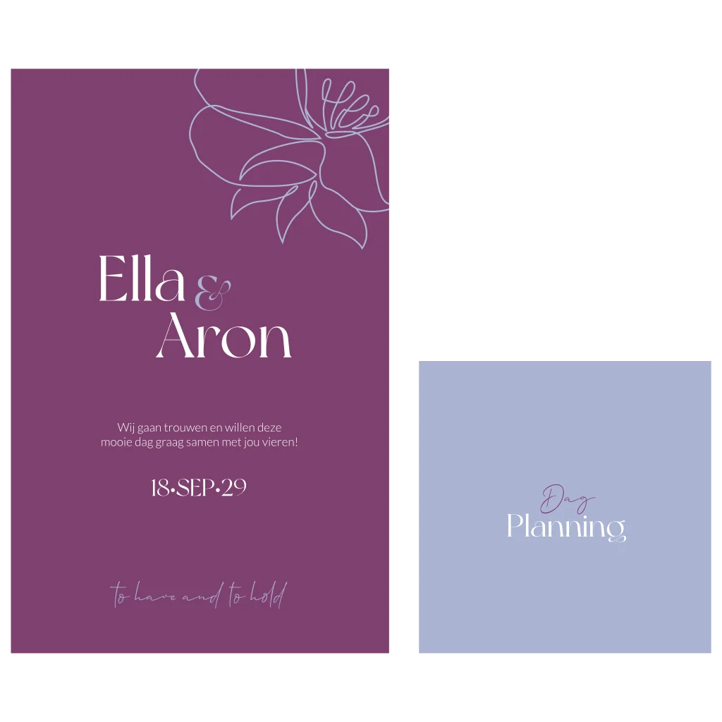 Paarse trouwkaart set met lijntekening van een bloem. De trouwkaart heeft een paarse achtergrondkleur met een lila bloem en daarbij een vierkante dagplanning met achterop de verschillende onderdelen van jullie dag in leuke icoontjes. Maak de kaartjes aan elkaar vast met een paperclipje.