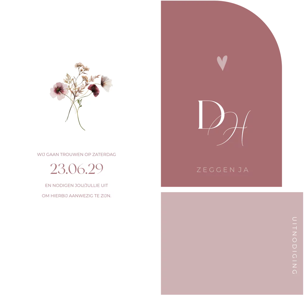 Unieke en stijlvolle stapelkaart voor een bruiloft. De kaart bestaat uit drie verschillende kaartjes en maak je aan elkaar vast met een paperclipje of lint. Dit moet je apart bijbestellen! Met de roze getekende bloemen geef je de kaart een romantische uitstraling. Bestel een proefdruk en laat je verrassen door deze unieke uitnodiging voor jullie bruiloft. In deze serie hebben we nog meer varianten. Vraag ons gerust om hulp. De roze lakzegel op de foto is maatwerk.