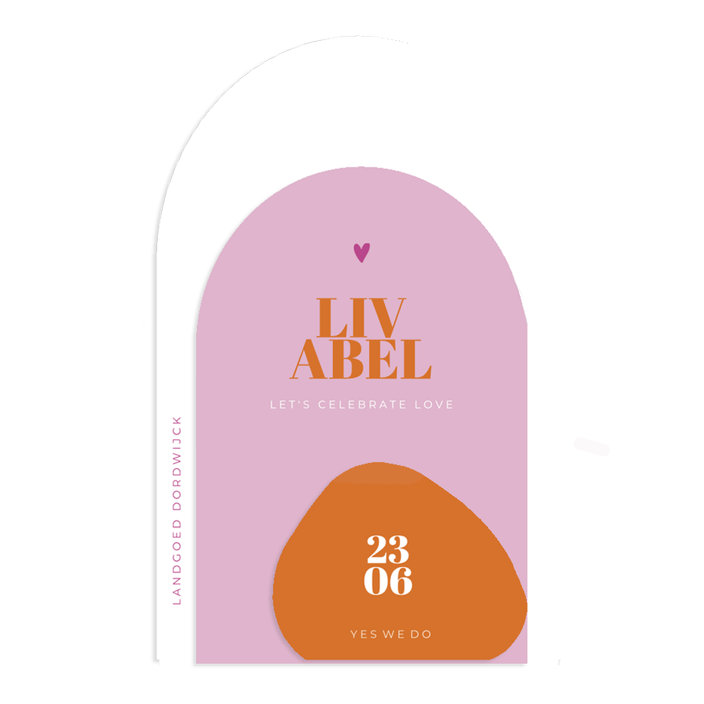 Hippe trouwkaart die bestaat uit drie verschillende kaartjes. De achterste kaart is wit met een boogvorm, daarop een roze kaart met boogvorm en het kleine oranje label heeft een organische vorm. Bewerk deze kaart in onze editor en pas eventueel de kleuren aan.