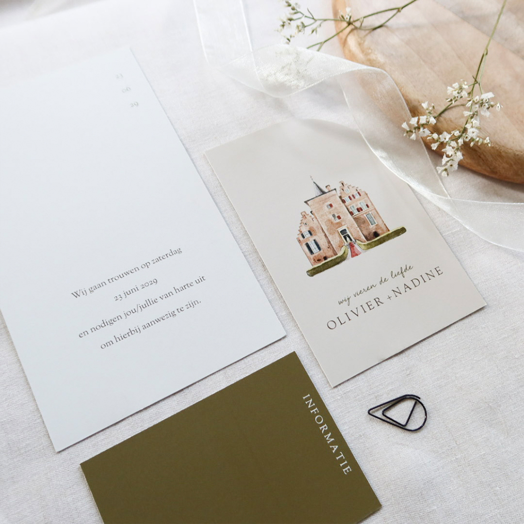 Deze trendy trouwkaart is een echte eyecatcher. Het is een stapelkaart die bestaat uit 3 verschillende kaartjes. Je legt ze op elkaar en maakt ze vast met een paperclipje of touw. Op het bovenste kaartje staat de trouwlocatie van kasteel wijenburg en jullie namen in goudfolie, daaronder een groen kaartje met extra informatie achterop en de onderste kaart bevat de uitnodiging en alle informatie. Liever een andere locatie, laat het ons weten!