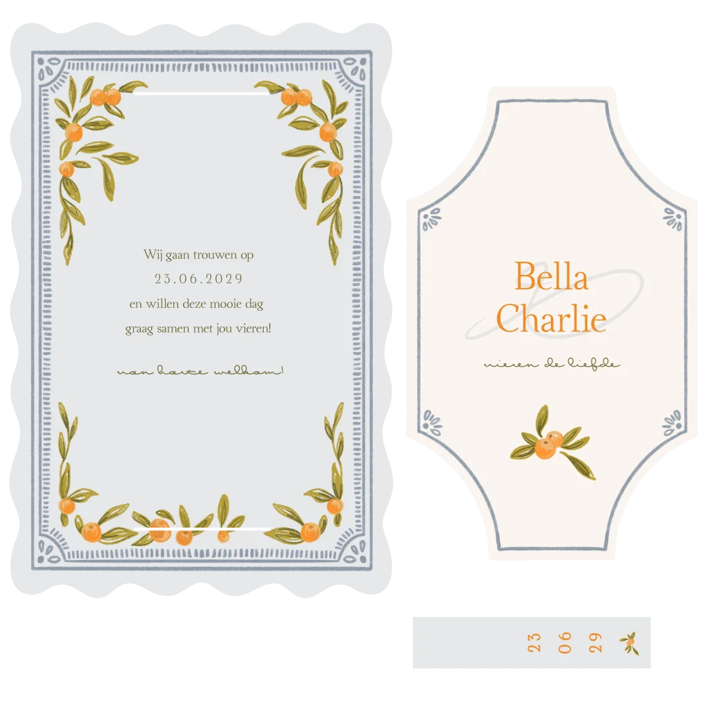 Trouwkaart getekend sinaasappels met los label