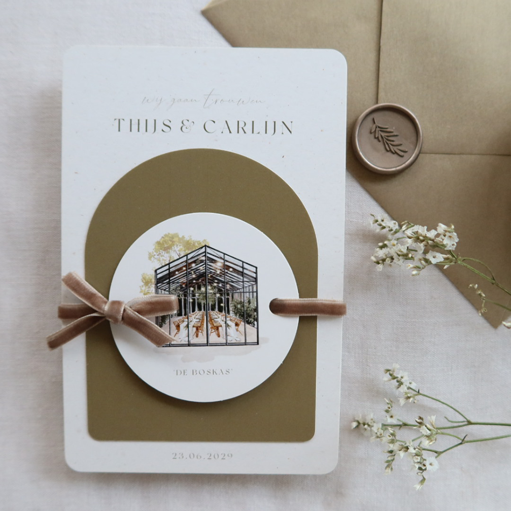 Trouwkaart die bestaat uit drie verschillende kaarten. Een beige kaart onderaan met de uitnodiging voor de bruiloft, het halfronde kaartje in het groen met achterop de verschillende onderdelen van jullie bruiloft en het ronde kaartje met boorgaten met de trouwlocatie, hier kun je mooi lint of touw doorheen doen en de kaartjes zo aan elkaar vast maken. Op deze kaart staat een illustratie van de boskas in Nijmegen. Deze locatie kan je ook vervangen door een eigen locatie, die tekenen we op maat voor jullie of kies er eentje uit de beeldbank. Het lint op de kaart is het taupe fluwelen lint uit onze webshop.