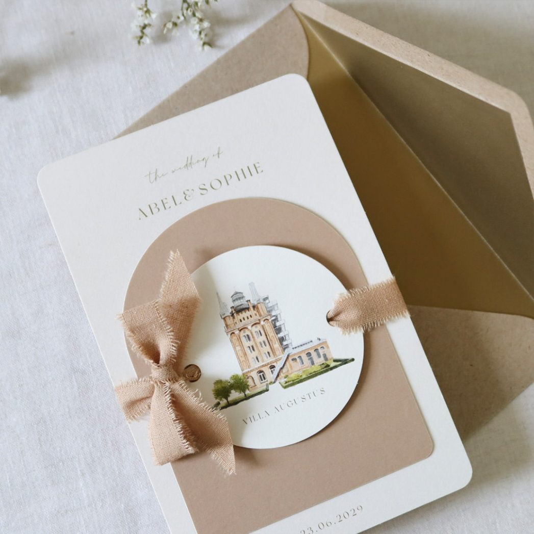 Trouwkaart die bestaat uit drie verschillende kaarten. Een beige kaart onderaan met de uitnodiging voor de bruiloft, het halfronde kaartje met achterop de verschillende onderdelen van jullie bruiloft en het ronde kaartje met boorgaten met de trouwlocatie, hier kun je mooi lint of touw doorheen doen en de kaartjes zo aan elkaar vast maken. Het lint op de foto is ter decoratie, gekocht via Amazon. De trouwlocatie kan je vervangen door een eigen locatie, die tekenen we op maat voor jullie.