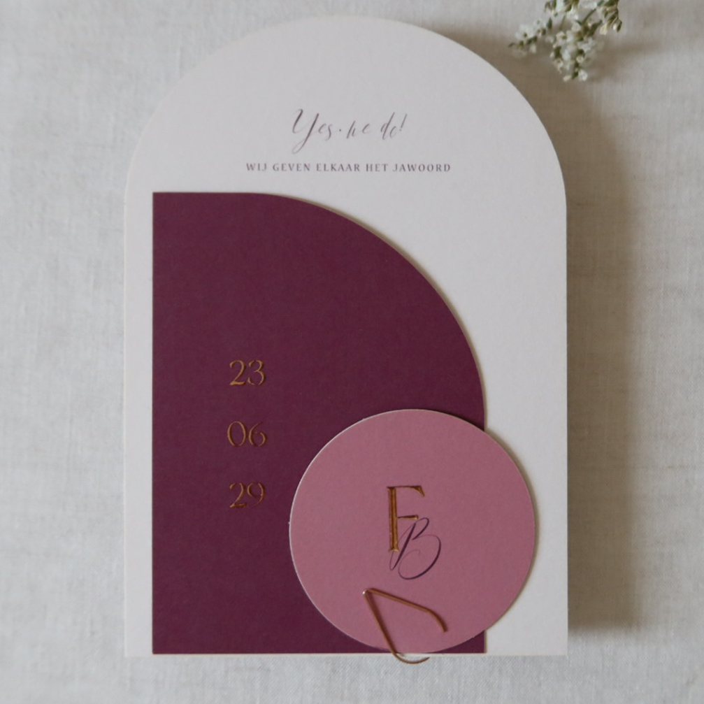 Trouwkaart set die bestaat uit 3 kaarten. De basiskaart heeft een boogvorm en een lila kleur. Daarop een kleiner kaartje in aubergine kleur met licht linnen structuurtje en de trouwdatum in rosé folie. Het ronde label bevat de initialen. Je kunt deze kaart naar wens aanpassen. Maak de kaarten aan elkaar vast met een roséfolie paperclip of een mooi lint.