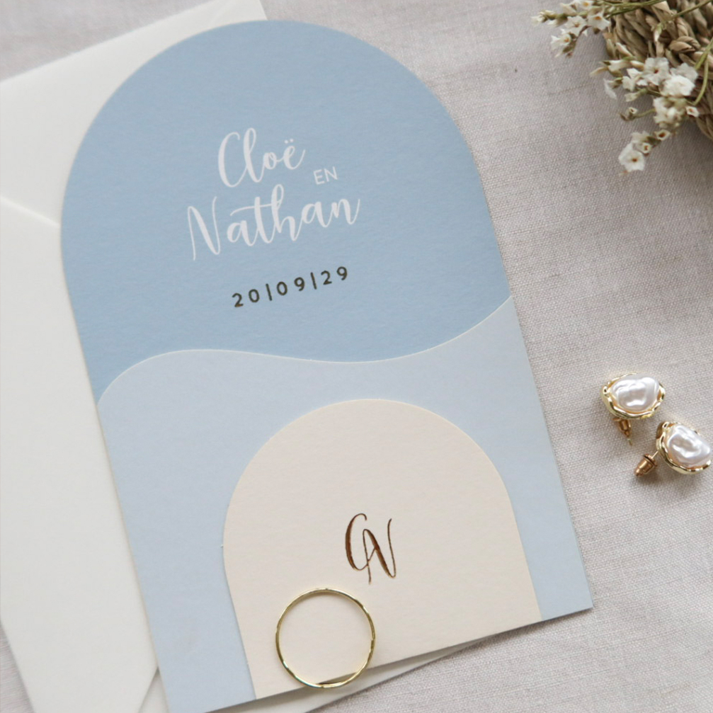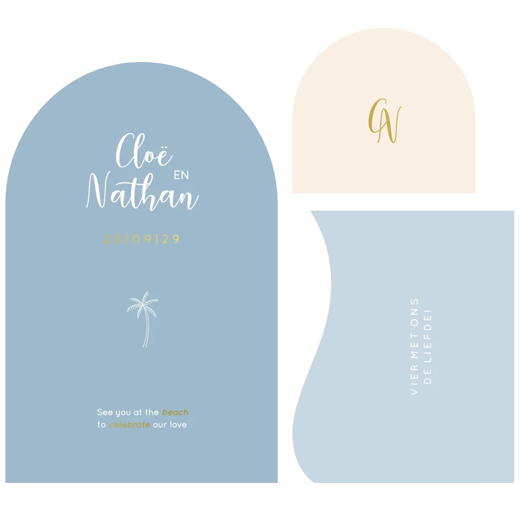 Hebben jullie gekozen voor een strand bruiloft? Dan is dit de perfecte trouwkaart voor jullie. Een boogvorm kaart met jullie namen en een illustratie van een palmboompje. Daarop een lichter blauw label met een golvende rand en de tekst: vier met ons de liefde. Het halfronde label bevat jullie initialen en achterop de dagplanning. De combinatie met de goudfolie letters op deze trouwkaart set is prachtig.