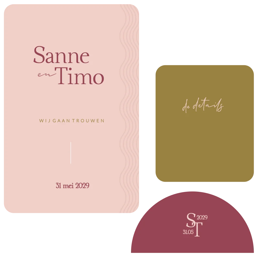 Mooie trouwkaart set met prachtige kleuren in groen en roze. De basis kaart heeft een roze kleurn en aan de zijkant een golfpatroon. Daarop een groen label met details en achterop belangrijke informatie voor jullie trouwdag. Het kleine donkerroze label bevat initialen en de trouwdatum. Maak de set aan elkaar vast met een paperclip of touw.