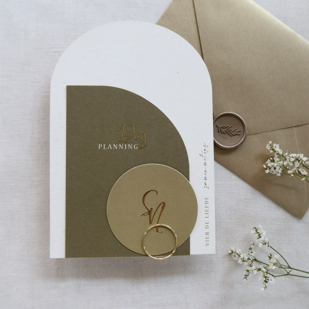 Trouwkaarten set bestaande uit drie verschillende kaartjes. De grote kaart heeft een mooie boogvorm, het kleinere kaartje een halve boogvorm en deze heeft een donkergroene achtergrond. Het ronde kaartje heeft een lichtere groene achtergrond en de initialen in mooi goudfolie. Maak de kaartjes aan elkaar vast met een paperclip of mooi lint.
