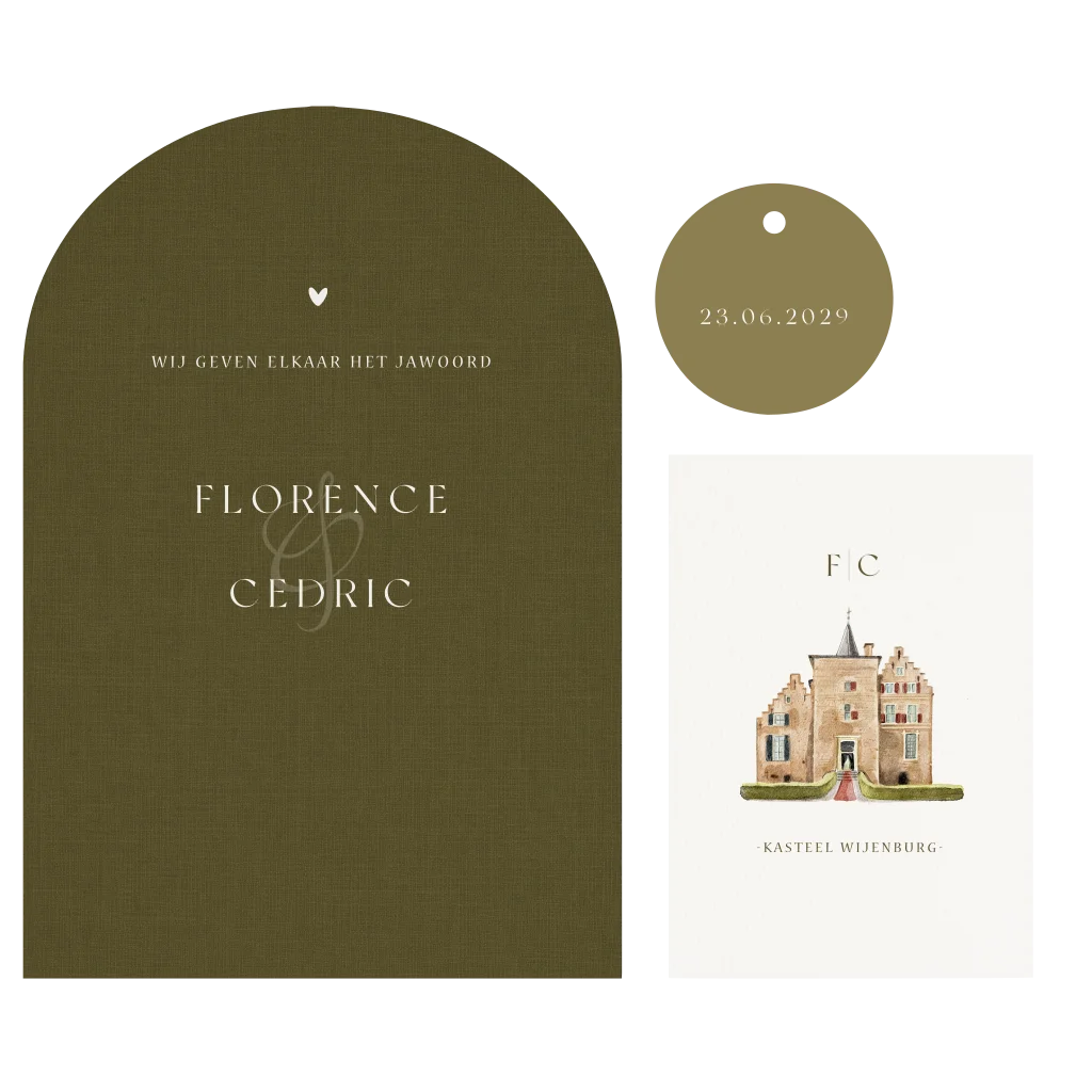 Mooie trouwkaart set in groene kleuren. De set bestaat uit drie kaartjes. De grote kaart heeft een ovale vorm en een donkergroene achtergrond met een heel licht linnen patroon. Daarnaast een kleiner beige kaartje met de locatie erop en achterop het dagprogramma. Het lichtere groene kaartje bevat de trouwdatum. Je kunt alles zelf aanpassen in onze editor, de teksten, de kleuren én de illustraties. Gaan jullie in een andere locatie trouwen dan kan je uit onze beeldbank een andere tekening kiezen of je trouwlocatie laten natekenen.