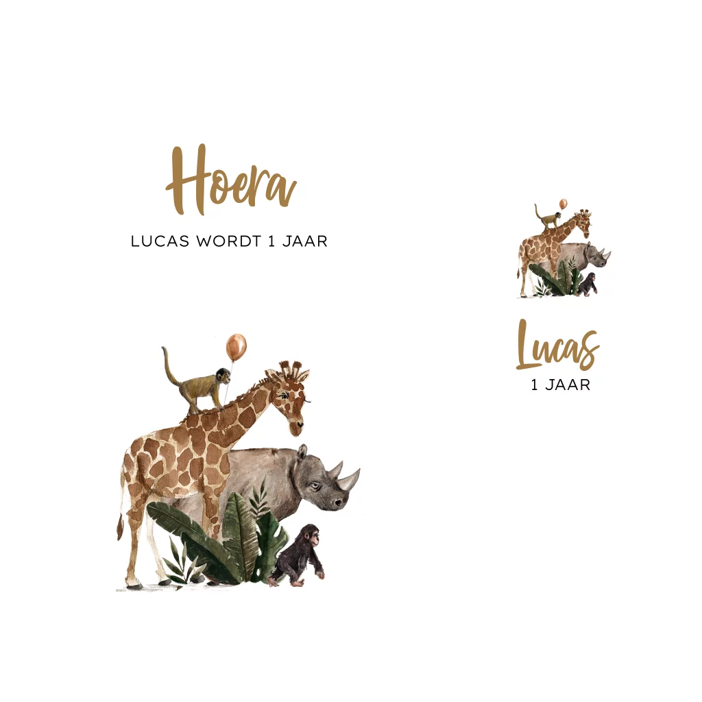 Vrolijke uitnodiging voor een kinderfeestje. Bij deze uitnodiging met jungledieren wordt ook een kleiner labeltje gedrukt in dezelfde stijl, deze kan je aan een traktatie hangen. De illustratie bevat een giraffe, aapjes en een neushoorn.