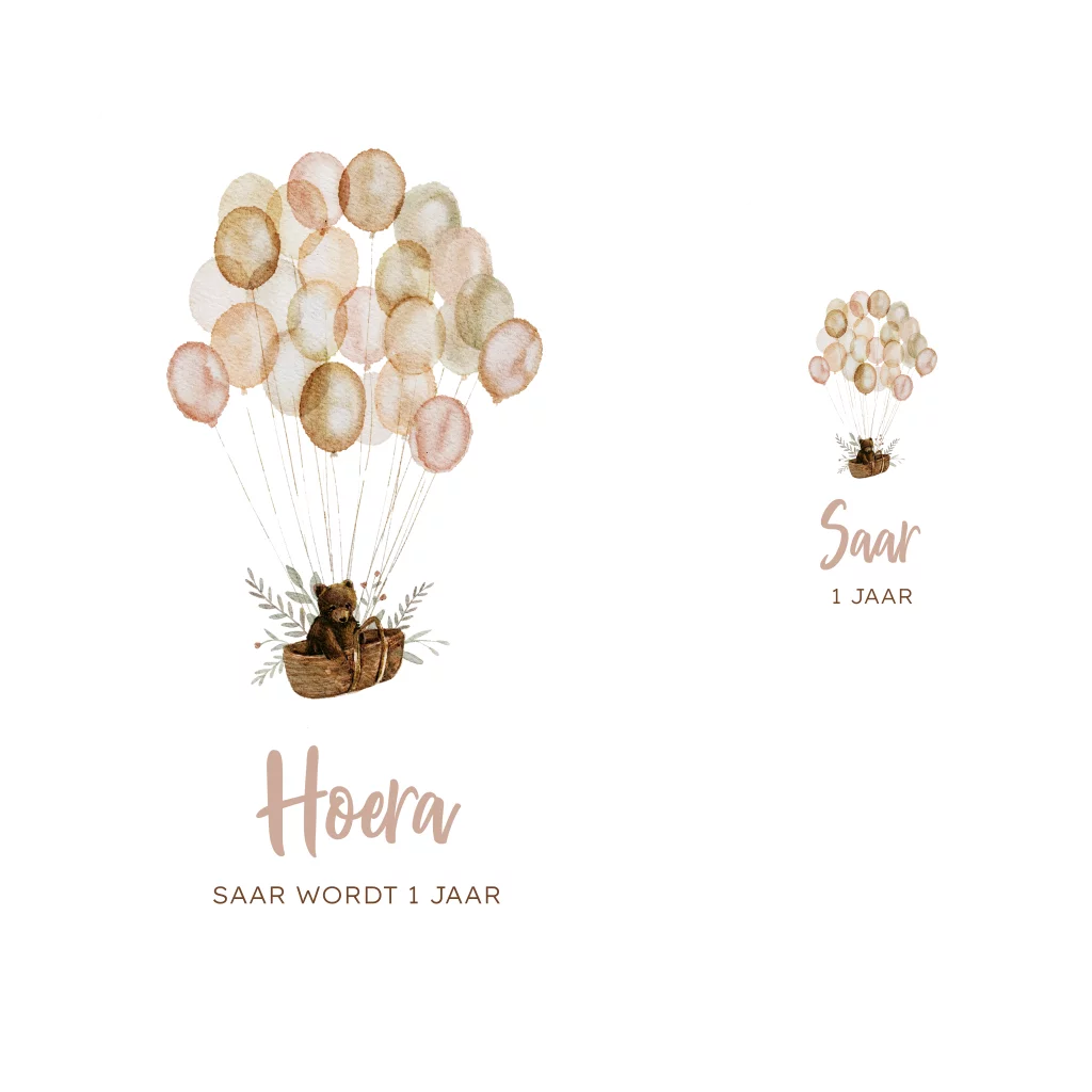 Vrolijke uitnodiging voor een kinderfeestje. Op de kaart voor een meisje staat een beer in een mandje met bloemen en daarboven hangen roze ballonnen. Bij deze kaart wordt een labeltje gedrukt in dezelfde stijl die je aan een traktatie kunt hangen. Unieke kaart met ronde hoeken die je zelf kunt aanpassen.