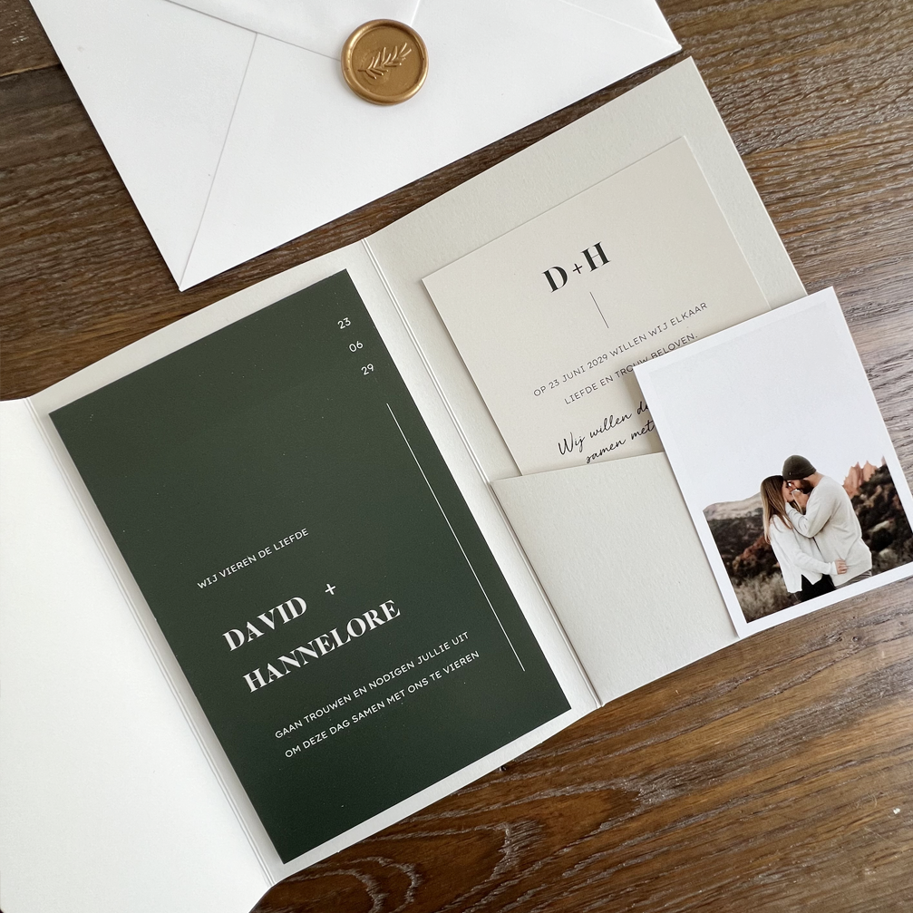 Op zoek naar exclusieve trouwkaarten voor jullie grote dag? Deze pocketfold trouwkaart bestaat uit meerdere kaartjes in een klassiek en origineel ontwerp dat perfect past bij elk seizoen. Deze unieke trouwkaart bestaat uit drie verschillende kaarten, elk met een eigen karakter. De hoofdkaart, met zijn donkergroene achtergrond en klassieke lijnen, vormt het middelpunt van deze prachtige set. Naast de hoofdkaart bevindt zich een iets kleinere kaart met alle belangrijke informatie over jullie trouwdag. Met een stijlvolle beige achtergrond en jullie initialen als subtiel detail, is deze kaart een prachtige aanvulling op het geheel. Het kleine kaartje bevat een foto van jullie, waardoor het een persoonlijk en uniek tintje toevoegt aan jullie uitnodiging.
