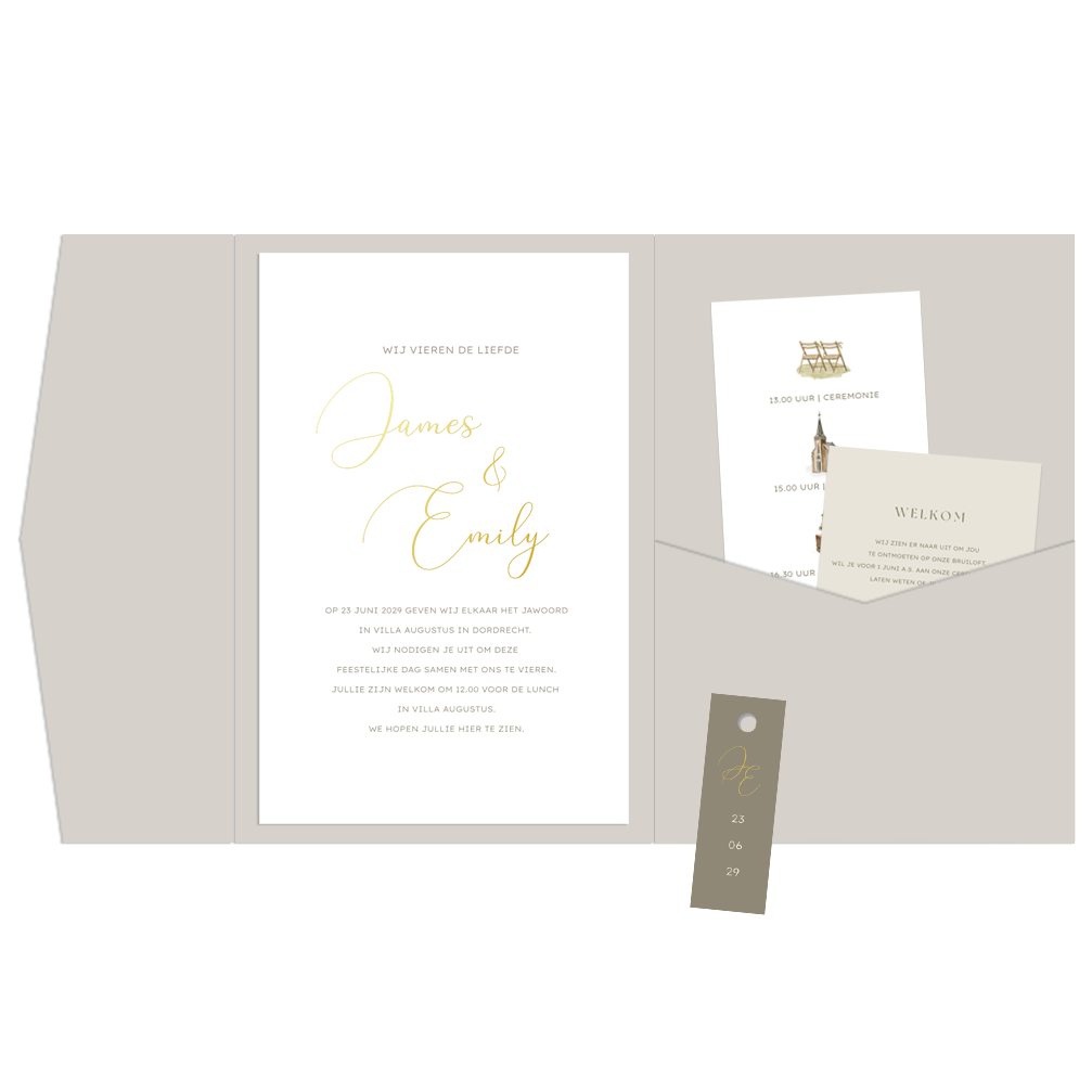 Zoek je een unieke uitnodiging voor jullie bruiloft? Deze kaart bestaat uit vier verschillende kaartjes, een witte trouwkaart met sierlijke goudfolie namen en een uitnodigingstekst. Daarbij een smaller label met getekende pictogrammen en het programma van jullie trouwdag. Een klein label met gasten informatie en een labeltje met een gat waarmee je de pocketfold hoes vast kunt maken. Je ontwerpt alle kaartjes in één keer en verstuur ze dan in een pocketfold hoes.