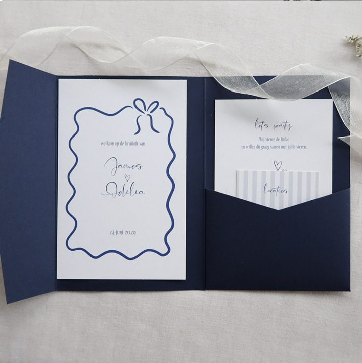 Deze pocketfold is helemaal de trend van nu. De kleur van de basis trouwkaart is blauw met wit. Daarop staat een border en een strik. Op de kleinere kaart staan pentekeningen van een stuk bruidstaart, een glas wijn en een wijnfles. Op het kleine kaartje met een achtergrond van blauwe strepen staan de locaties. Achterop kan je nog informatie zetten over de tijden.