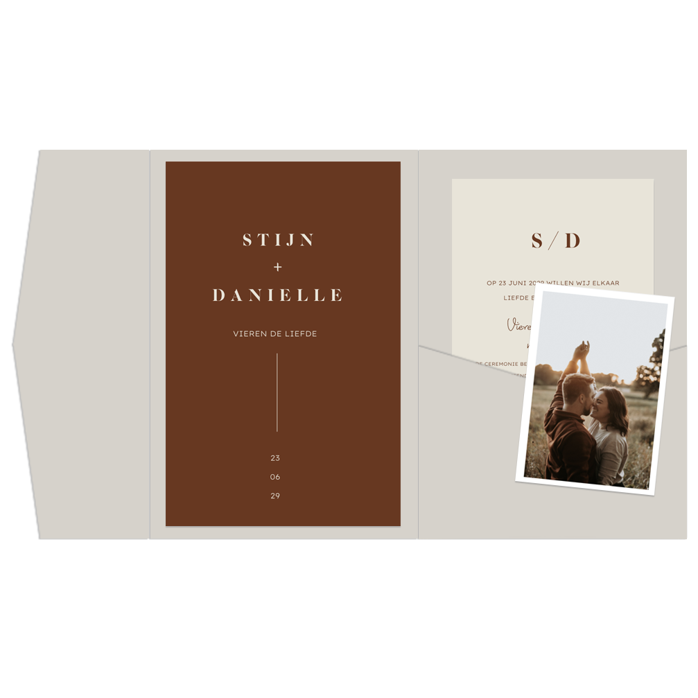 Op zoek naar exclusieve trouwkaarten voor jullie grote dag? Deze pocketfold trouwkaart bestaat uit meerdere kaartjes in een klassiek en origineel ontwerp dat perfect past bij elk seizoen. Deze unieke trouwkaart bestaat uit drie verschillende kaarten, elk met een eigen karakter. De hoofdkaart, met zijn roestbruine achtergrond en klassieke lijnen, vormt het middelpunt van deze prachtige set. Naast de hoofdkaart bevindt zich een iets kleinere kaart met alle belangrijke informatie over jullie trouwdag. Met een stijlvolle beige achtergrond en jullie initialen als subtiel detail, is deze kaart een prachtige aanvulling op het geheel. Het kleine kaartje bevat een foto van jullie, waardoor het een persoonlijk en uniek tintje toevoegt aan jullie uitnodiging. Voeg alle kaarten toe aan een pocketfold mapje en je hebt een prachtige set. Maak de kleuren mooi passend bij je foto, wij kunnen je hier altijd mee helpen.