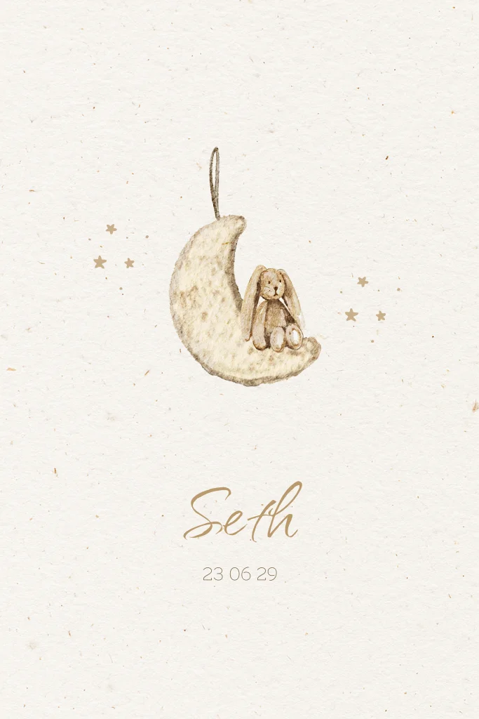 Een neutrale poster met een konijntje dat op een maan zit. De rustige kleuren en minimalistische stijl maken de poster geschikt voor zowel jongens als meisjes.