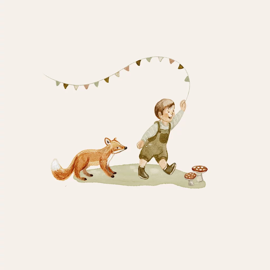 Geef de kinderkamer een speelse en persoonlijke touch met onze unieke posters. Op de poster zie je een jongen met een vlaggenlijn in zijn hand en daarachter een vosje.Met vrolijke illustraties en hoogwaardige prints brengen deze posters de kamer van je kleintje tot leven. Deze posten wordt vierkant gedrukt, eenvoudig op te hangen en ideaal als cadeau! Deze kan je combineren met het geboortekaartje uit deze serie.