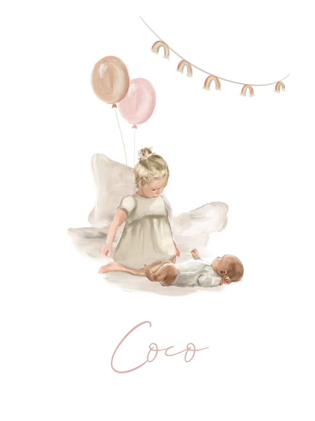 Deze unieke poster met een prachtig geschilderd zusje en kleurrijke ballonnen is een lieve en sfeervolle toevoeging aan iedere kinderkamer. Perfect als herinnering aan een bijzondere gelegenheid of gewoon als decoratie. Een tijdloos en uniek ontwerp!