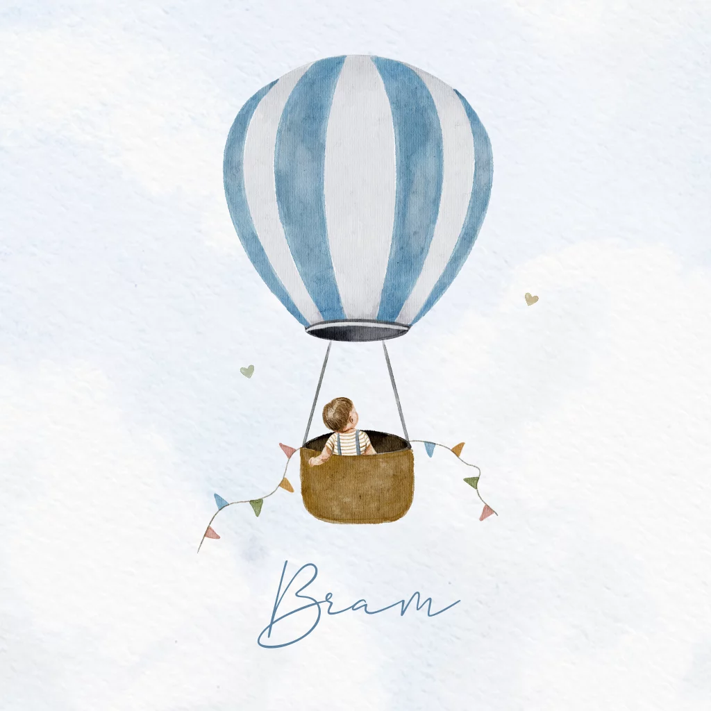 Prachtig getekene poster voor de zomer. De achtergrond heeft een blauwe lucht en in de lucht vliegt een blauwe luchtballon met witte strepen. In het mandje van de ballon zit een jongetje. De vrolijk gekleurde vlaggen maken dit kaartje voor jullie zoontje helemaal af. De poster past bij het geboortekaartje in dezelfde stijl.