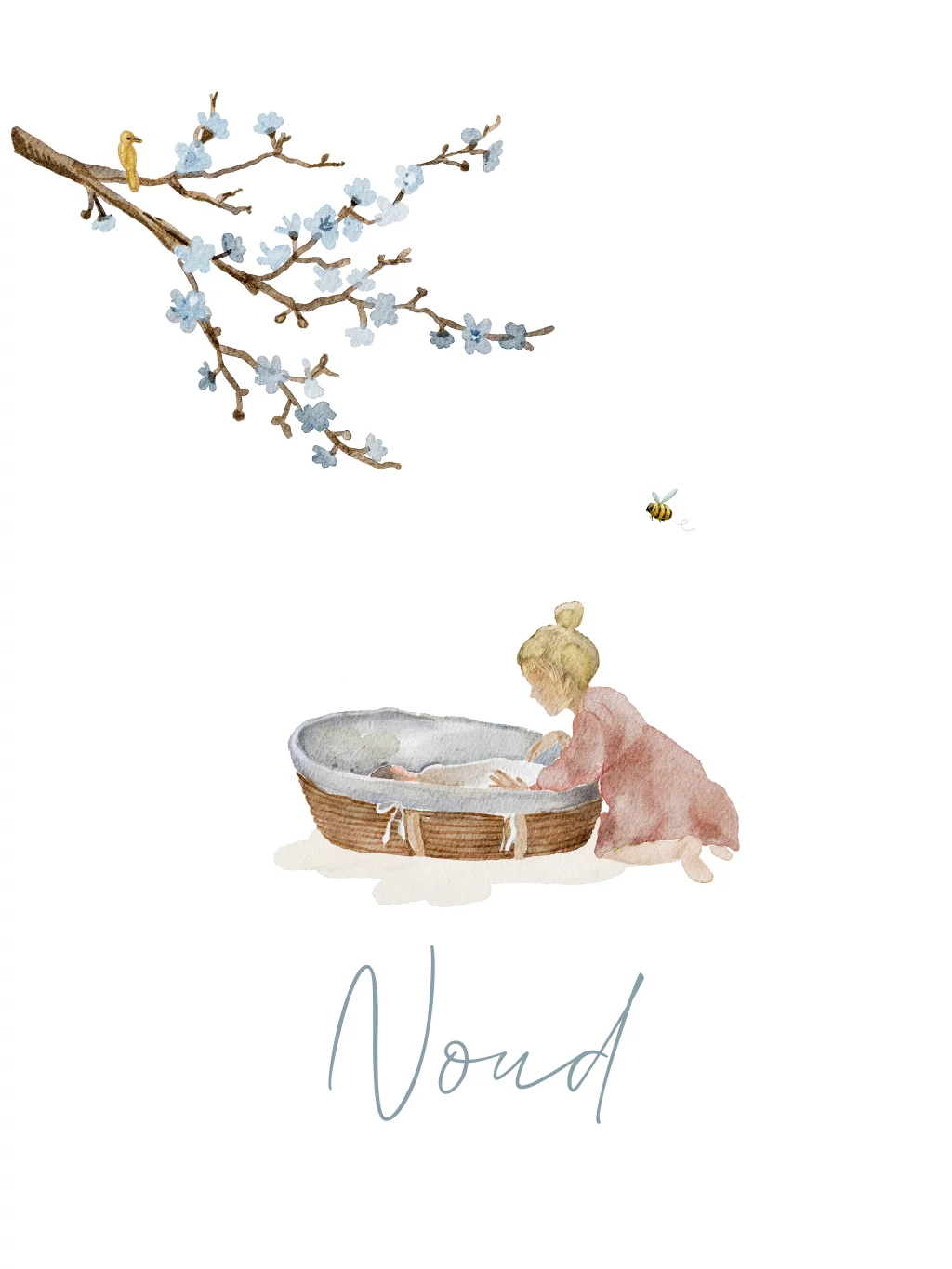 Deze mooie poster viert de komst van jullie tweede kindje. Met een schattig mandje, bloesem en blauwe accenten is het een stijlvolle manier om de geboorte van jullie jongen aan te kondigen. Perfect voor de kinderkamer en om de zus te betrekken in dit bijzondere moment!