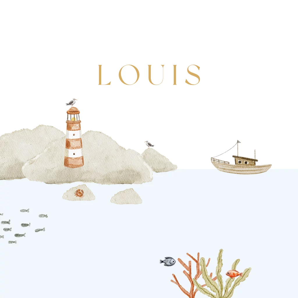 Vrolijke poster met waterdieren, een vuurtoren en een bootje. Perfect voor de kinderkamer of als zomerse decoratie. In dezelfde stijl als het geboortekaartje uit deze serie.