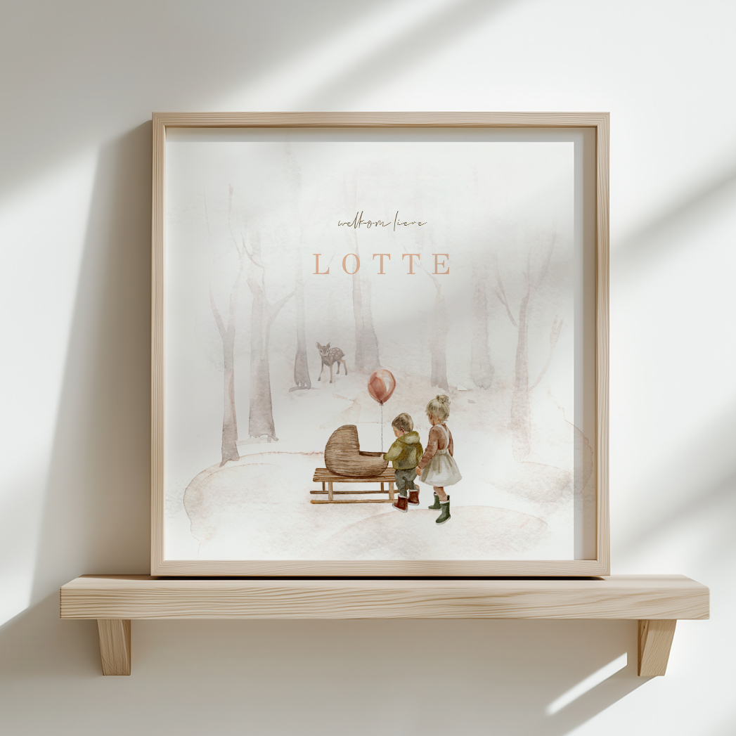 Winter poster voor de kinderkamer voor een zusje. Deze winter poster heeft een achtergrond van een bos in aquarel. In de verte staat een hertje. Voorop staat een slee met een wiegje. Naast de slee staat een oudere zus naast een broertje. Je kunt de kindjes ook weghalen als het jullie eerste kindje wordt. Past bij het geboortekaartje in dezelfde stijl.