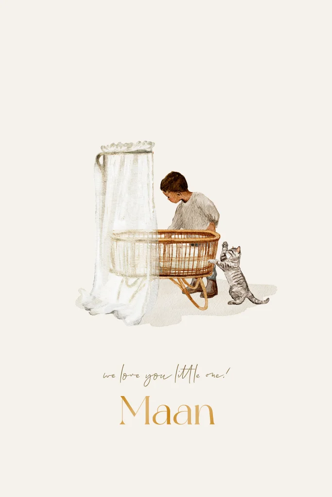 Deze babykamer poster van Fientje & Co toont een broer met zijn zusje bij het wiegje, samen met een getekende kat. De illustratie is rustig, minimalistisch en past goed in een neutrale of moderne babykamer.